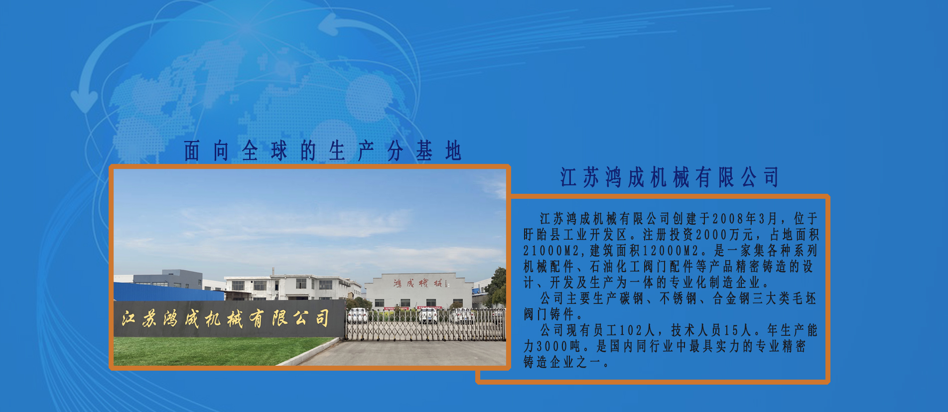 鄞州鴻成機(jī)械有限公司通過(guò)全體員工的團(tuán)結(jié)奮進(jìn)、頑強(qiáng)拼搏,發(fā)展迅速,公司占地面積7200平方米,已有員工180余人,擁有各類專業(yè)技術(shù)人員。專業(yè)生產(chǎn)各類普碳鋼、合金鋼、不銹鋼、精密鑄造產(chǎn)品廣泛用于冶金、礦山、石油、化工、鐵路、船舶、車輛等機(jī)械制造行業(yè)年產(chǎn)精鑄件2500噸以上。